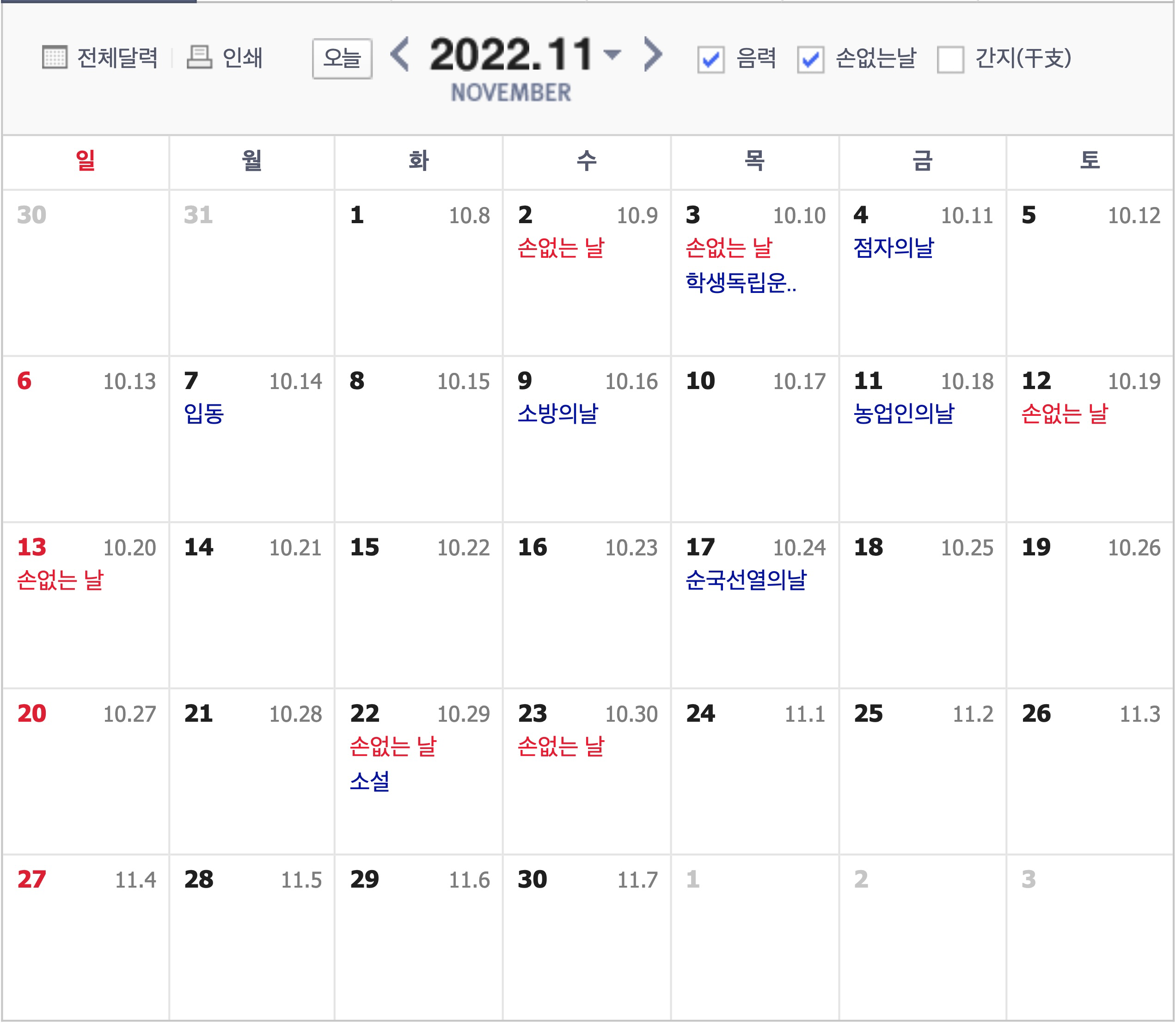 2022년 11월 손없는 날에 대한 정보를 확인해 보았습니다. 아래를 확인해 보시고 여러분들의 일정을 만드는데 도움이 되셨으면 좋겠습니다.