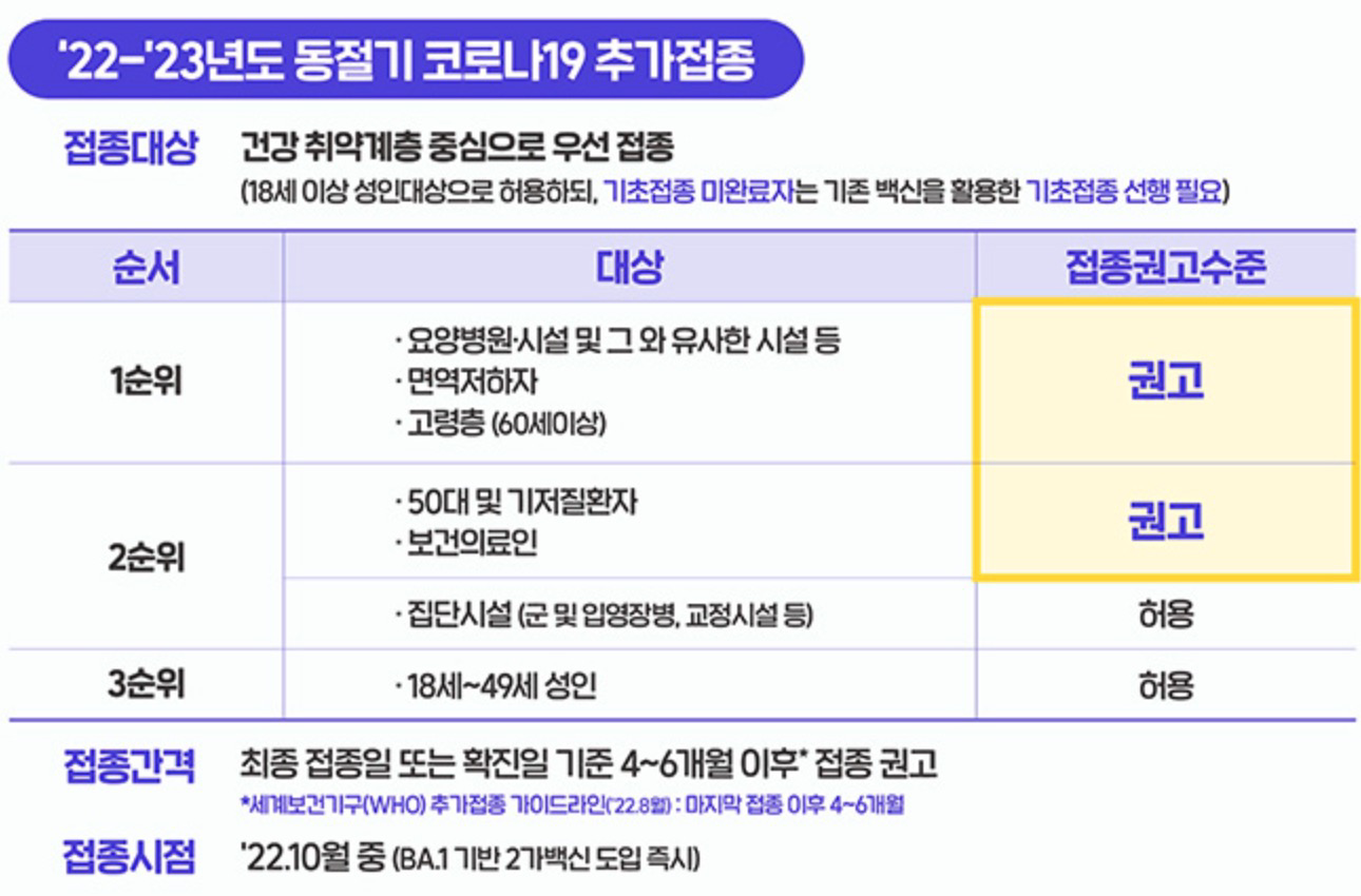 - 1순위 권고 : 요양병원 시설 및 그외 유사시설 종사자 / 면역저하자 / 고령층(60세 이상)