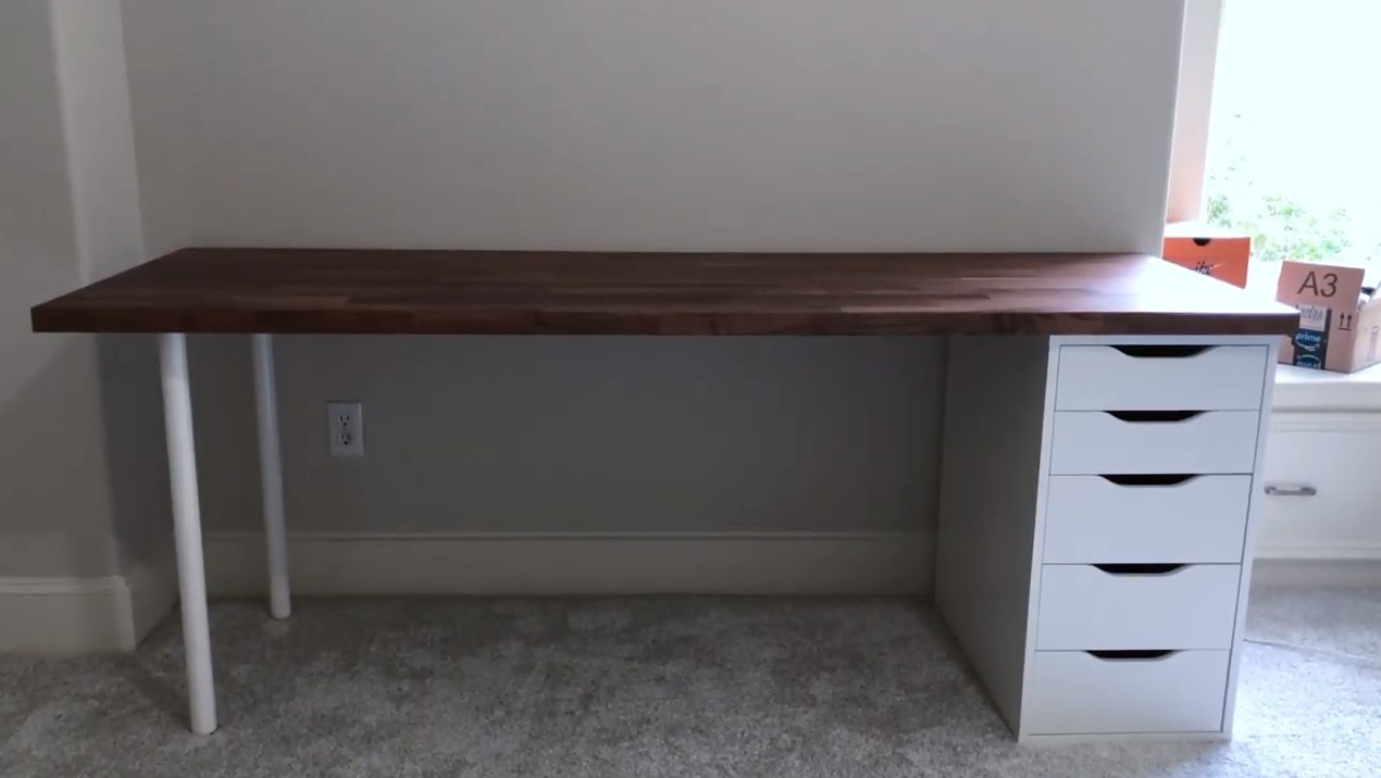이것은 원래 조리대 원목상판입니다만, 이 상판을 그대로 넓은 테이블 상판으로 쓰는 여러가지 조합들이 있습니다. 특히 이럴 경우 가장 많이 쓰이는 수납유닛인 알렉스 ALEX와 궁합이 매우 좋습니다. 구글에서 'Karlby Desk'라고 쳐보시면 아무 많은 사례들이 있으니 참고하실 수 있을겁니다. 사진으로 보시는 것은 호두나무 상판의 월넛 느낌이고, 자작나무 무늬목의 좀 더 화사한 색도 있습니다.